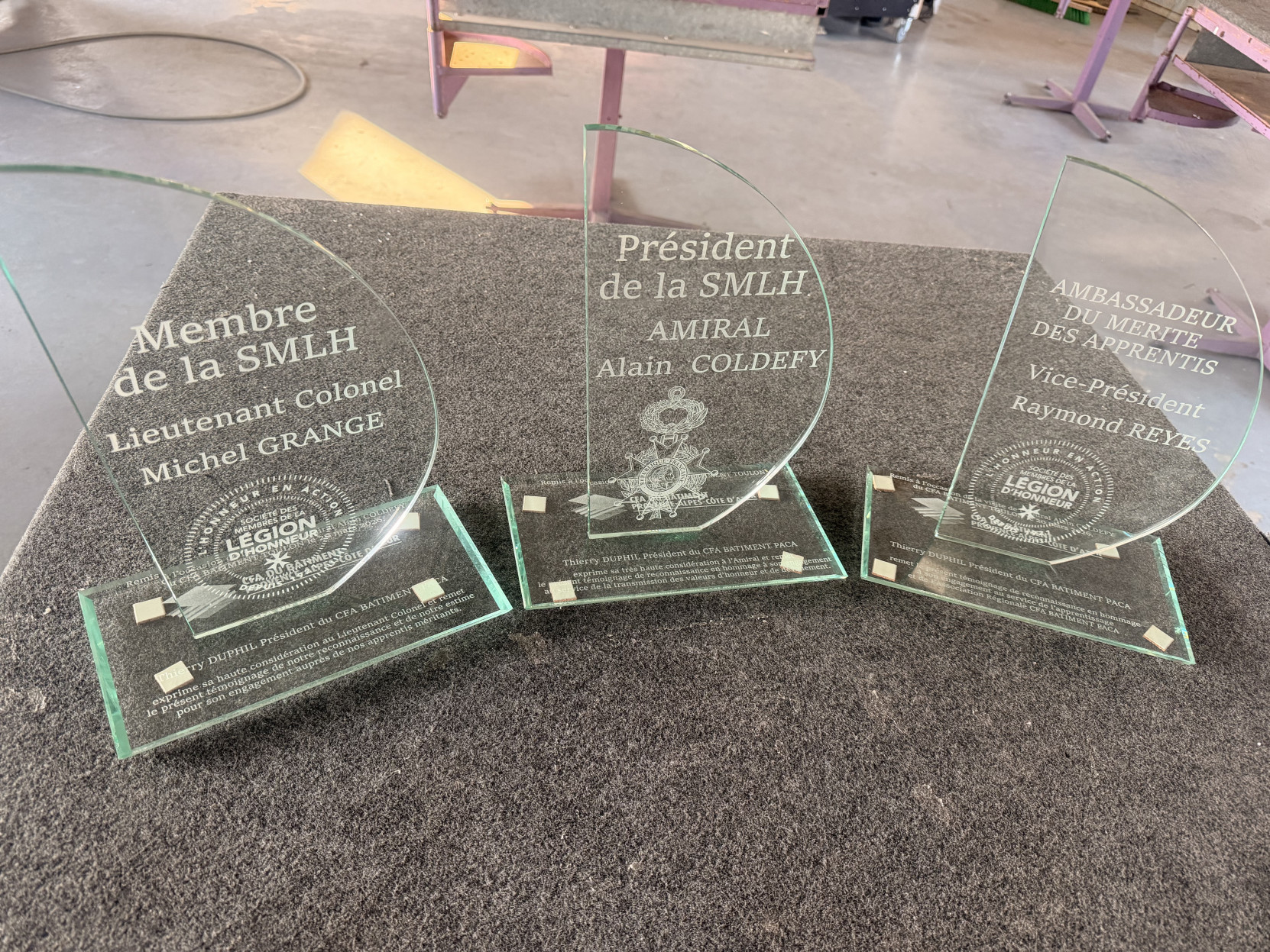 Pour cette occasion Guillaume Gavasco formateur en Menuiserie Aluminium Verre au CFA de Toulon a réalisé avec son groupe d’apprentis BP 1ere année de magnifiques œuvres en verre sablé au nom et au titre de chacune des trois personnalités présentes décorées de la légion d’honneur : l’Amiral Coldefy, le Lieutenant-Colonel Michel Grange, et Raymond Reyes ambassadeur du mérite des apprentis.
