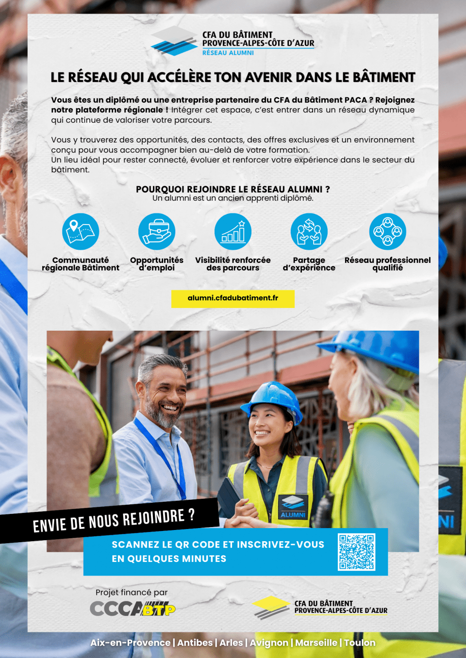 Simple et accessible, la plateforme Alumni renforce les liens entre les CFA, les diplômés et les entreprises, tout en soutenant les parcours professionnels dans le secteur du Bâtiment.